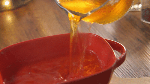 4. 将蜜瓜汁倒入果冻粉溶液中,搅拌均匀。